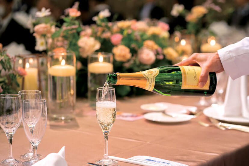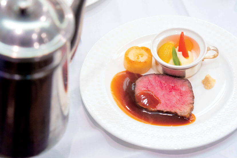料理はスタンダードなコースよりワンランクアップ。メインの国産牛肉のローストビーフは、シェフによるフランベとカービングの演出も好評。