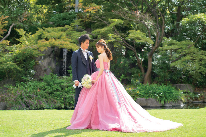 ピンクのふわふわなドレスは庭園の緑にも映えて。