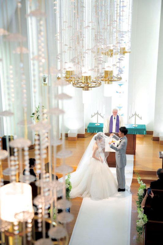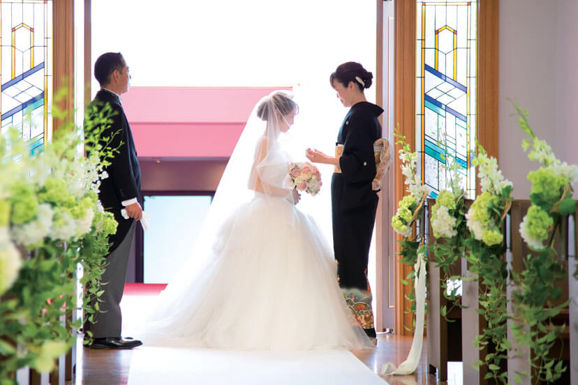 挙式のスタートは、母からのベールダウン。父が見守るなか、気持ちが通じ合って忘れられない瞬間となった。