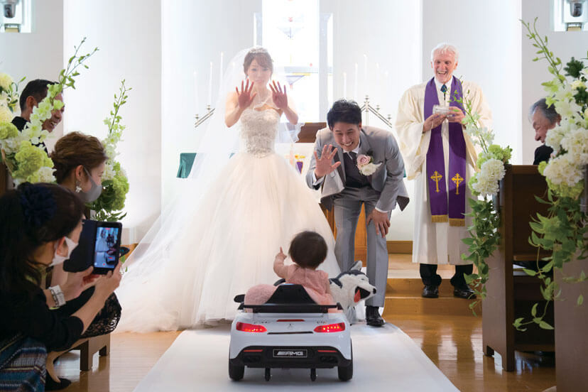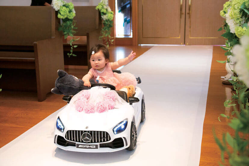 リングガールは新婦の姪。まだあまり歩けない時期だったので新郎の愛車にそっくりの電動乗用ミニカーで登場。一生懸命に大役を務めた可愛い姿を見守りながら、みんなが笑顔に。