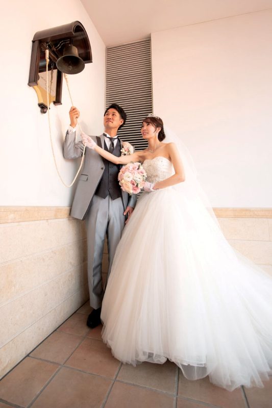 挙式後、鐘を鳴らすふたり。連動している大きな鐘の音が青空に響き渡り、幸せが広がっていくよう。