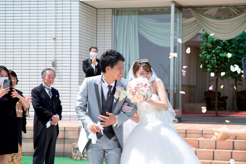 集まってくれた親族からフラワーシャワーの祝福を受けるふたり。両家の距離も近くなり、喜びと共に一体感に包まれた。