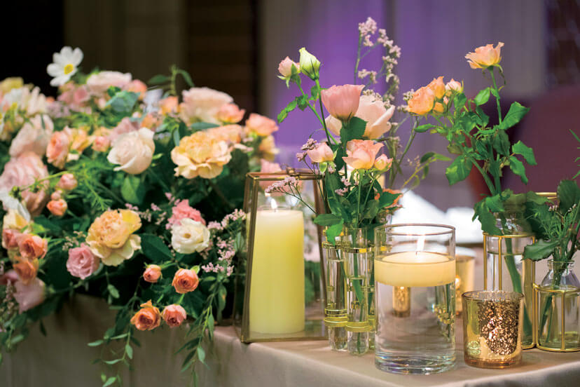 淡いピンクと白のバラを中心にキャンドルを配した上品な雰囲気のフラワーコーディネート