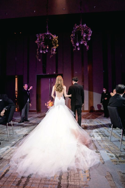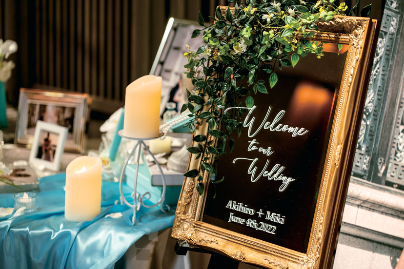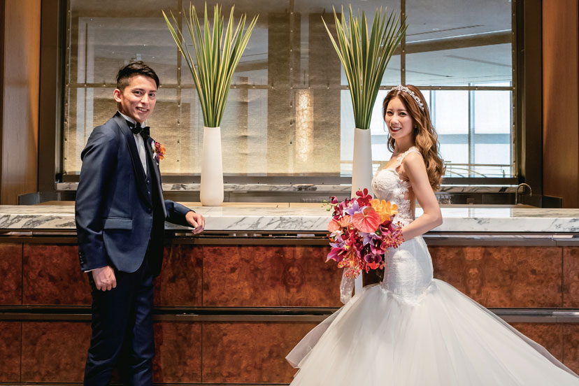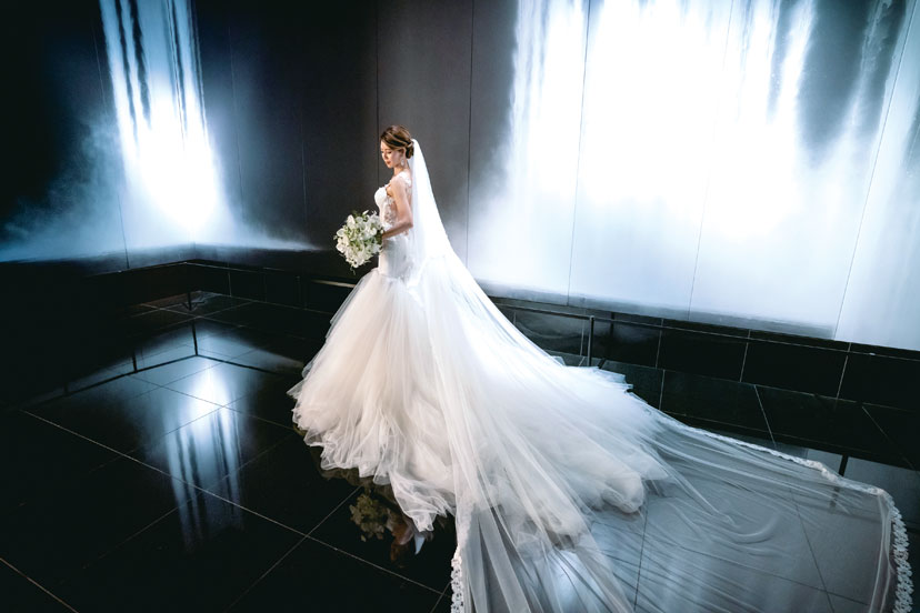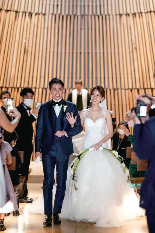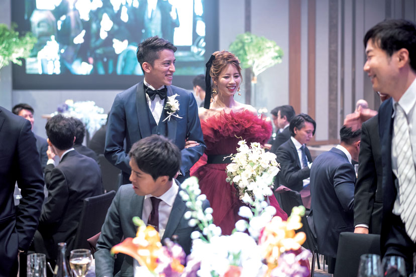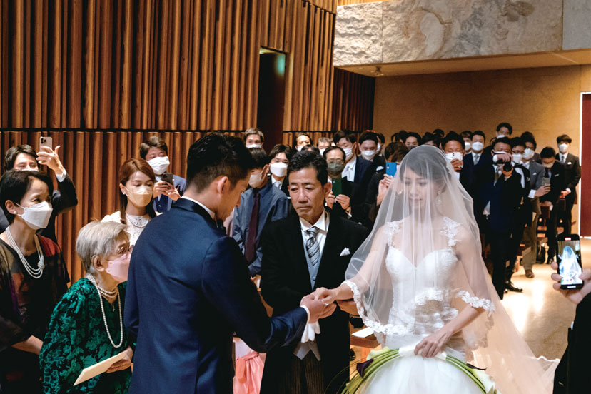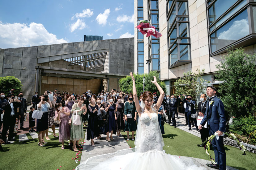 結婚式は高齢の親族も含め、大切な方々を招待したいと会場探しをスタート。スタッフのホスピタリティを絶対条件に、会場を15軒見学した。その中で、ふたりの意見が一致したのが「グランド ハイアット東京」。特にチャペルのスタイリッシュな雰囲気、フェアで試食した料理は味わいも見た目も華やかで、ここならゲストに喜んでもらえると確信した。新婦のもうひとつのこだわりはドレス。5年前にSNSで見て一目惚れした「ガリア ラハヴ」のドレスで晴れの日を迎えた。当日は雨予報だったのが見事な晴天に。青空の下でのフラワーシャワーは、ゲストからの「キレイ」「おめでとう」の言葉がうれしい思い出となった。披露宴は城ヶ島でドローン撮影したオープニングムービーから。思い出の写真を集めたムービーも上映し「懐かしい」「こんなのあったっけ?」などの声で会場が盛り上がった。準備期間中にウォーキングレッスンも受けたふたり。主役らしい堂々とした姿とスマートなエスコートを披露し、最高に美しい姿で、理想の一日を叶えた。