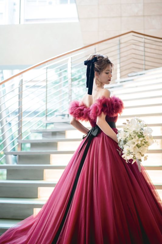 背中が大きく開いたドレスはボリュームたっぷりのチュールが華やか。