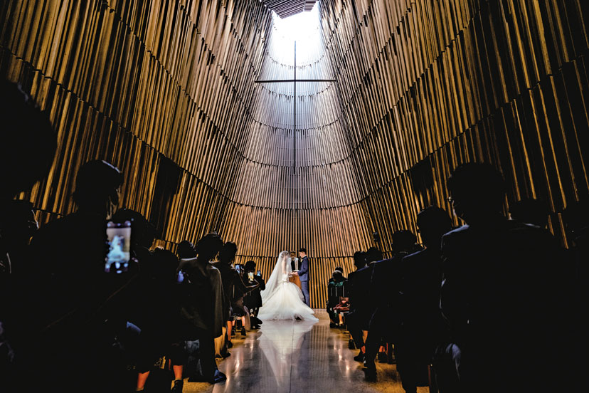 荘厳な雰囲気の祭壇に、細かいラメがキラキラと輝くホワイトドレスがゲストを魅了。