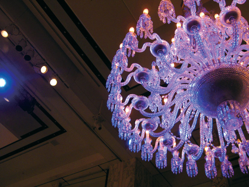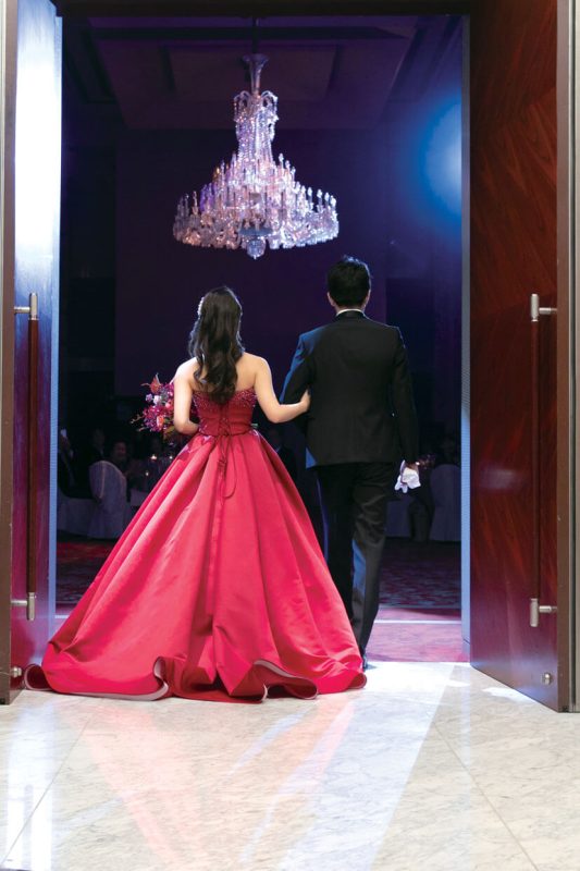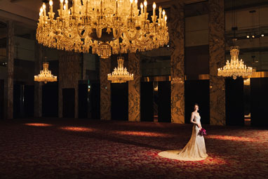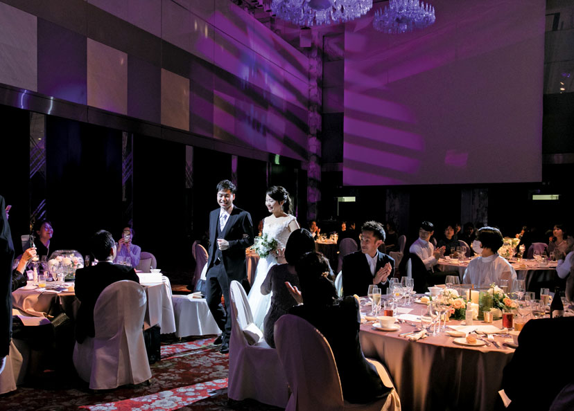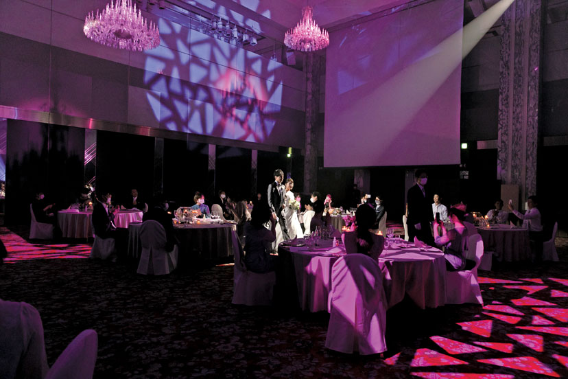 バカラのシャンデリアが煌めく天井高10mのボールルーム。光の演出で華やかに入場。