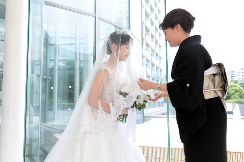 入場前、家族だけで行ったベールダウン。一緒にドレス選びをした母からの「本当に可愛い」の一言で思わず泣きそうに。