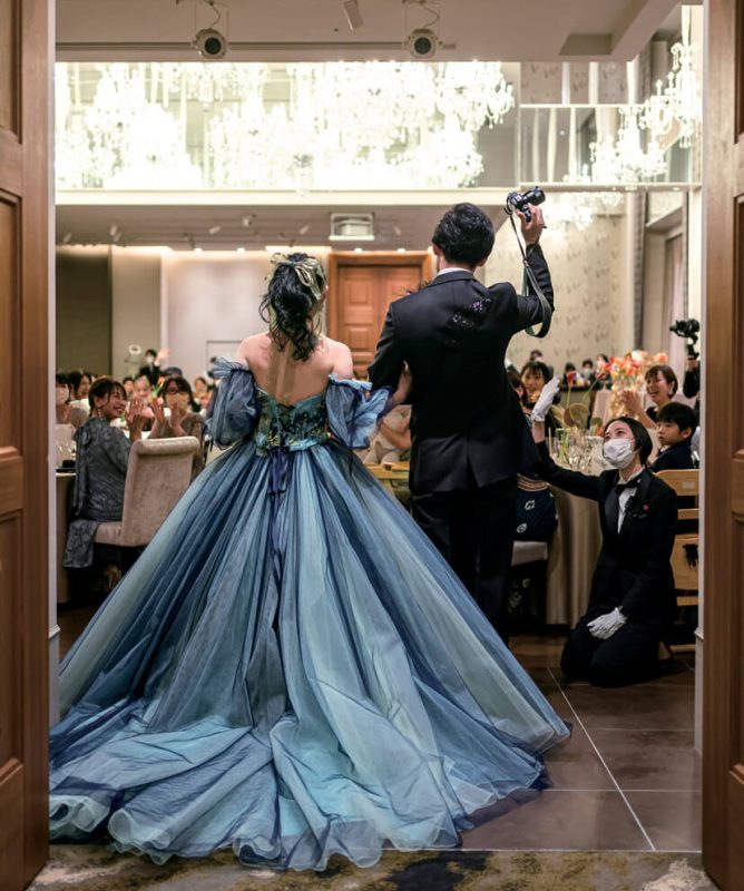 挙式ドレスからガラッと印象を変えて華やかなカラードレスで入場。新郎はカメラでゲストの笑顔を激写!