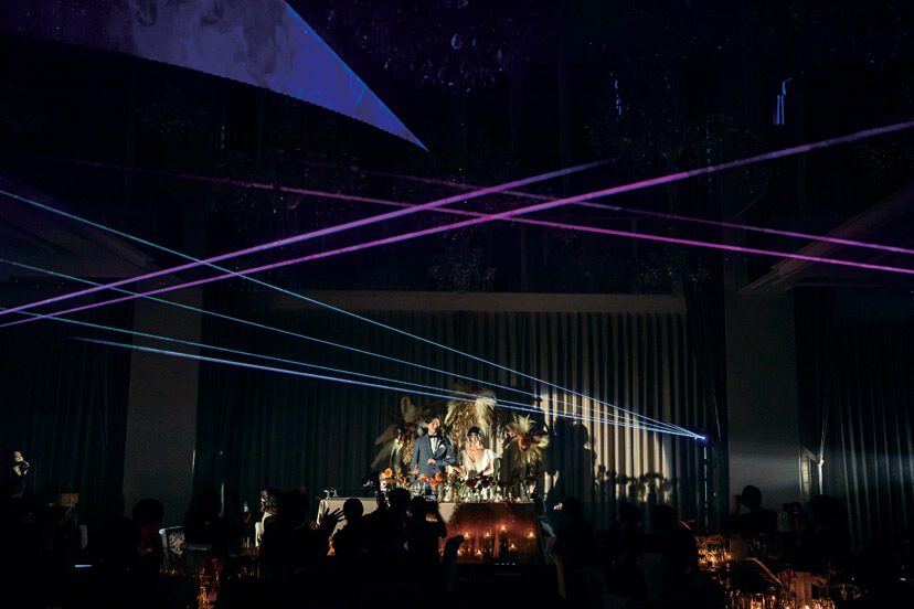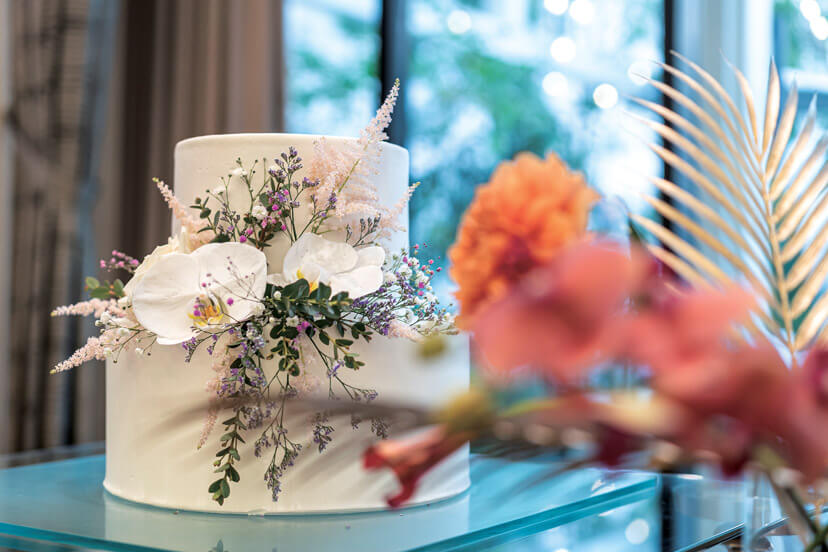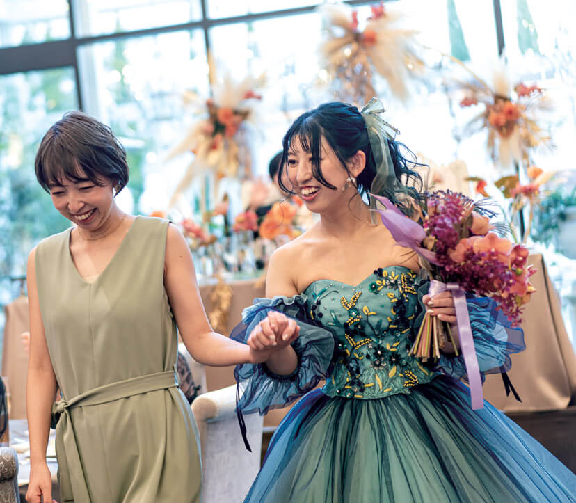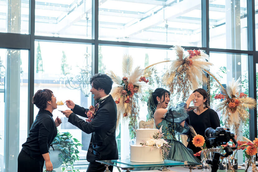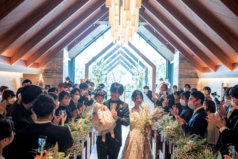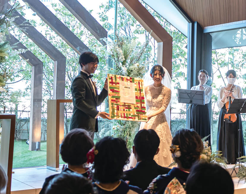 挙式は、木と石造りのモダンなチャペルでの人前式を選んだふたり。「誓いの言葉」には両家の母の深い愛が込められた特別なものを用意。リングガールをしてくれた娘と共に結んだ夫婦の絆に参列者から温かな祝福がおくられた。式後のサンクスギビングパーティでは、遠方から参加してくれたゲストに名古屋の嫁入りの風習「お菓子まき」の体験をプレゼント。楽しむゲストの様子にふたりも大満足。披露宴では、スタイリスト仲間のゲストも驚く、本当に似合う自分らしいドレススタイリングで登場。フォトグラファーの新郎は、カメラでゲストを撮りながら入場するなど、ふたりらしいサプライズ演出を盛り込んだ。おもてなしの料理には、東海地方の地産食材を使ったフレンチを用意。デザートブッフェも大好評で、コロナ禍で会えなかったゲストとの久しぶりの再会を喜び、談笑を満喫することができた。みんなに描いてもらった結婚証明書のキャンバスアートは一番の家宝として、結婚式の幸せいっぱいの思い出と共に今もリビングに飾られているそう。