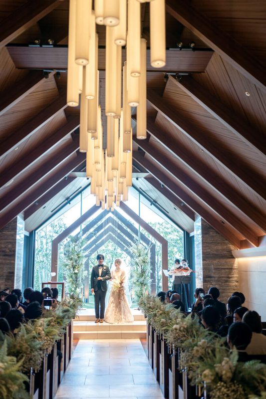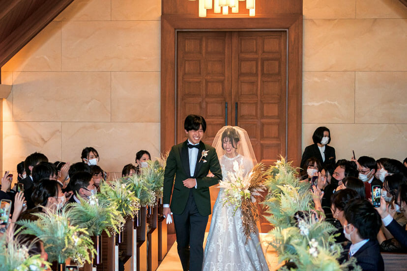 チャペルの扉が開き、ゲストの表情が見えた瞬間のうれしさと感動は今も忘れられないというふたり。人前式では、誓いの言葉を両家母に用意してもらった。