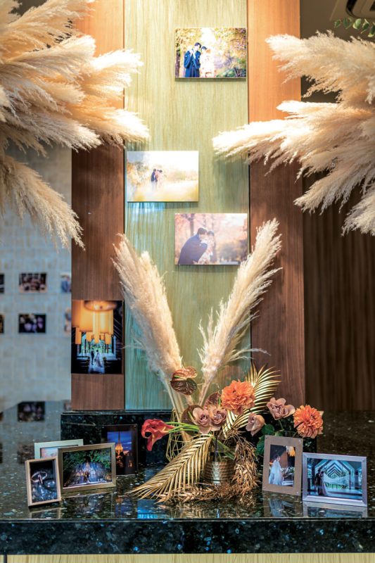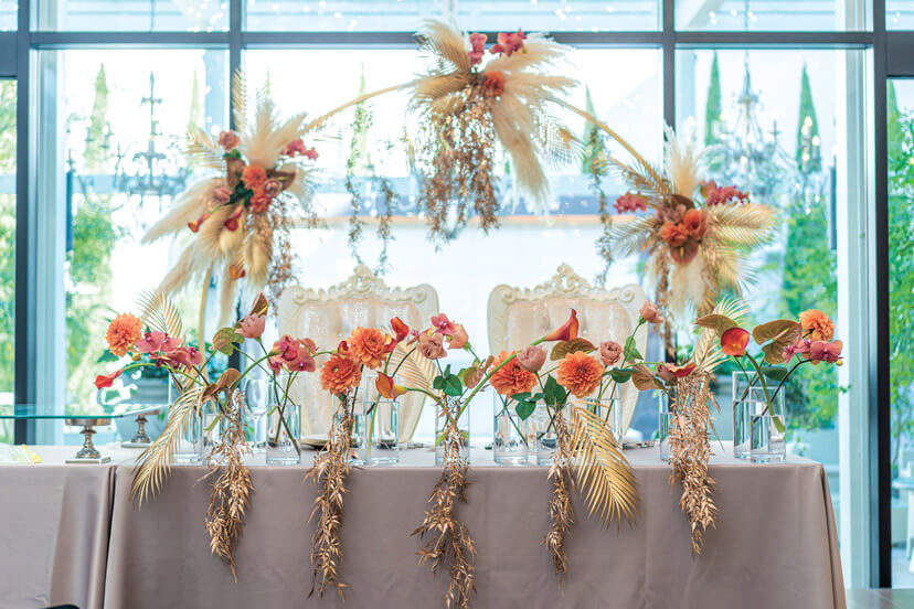 装花は信頼するフラワーアーティストにお任せ。卓上装花はゲストが会話しやすい高さに。リビングスペースいっぱいに新郎新婦とゲストの写真を展示したのはフォトグラファーの新郎のこだわり。
