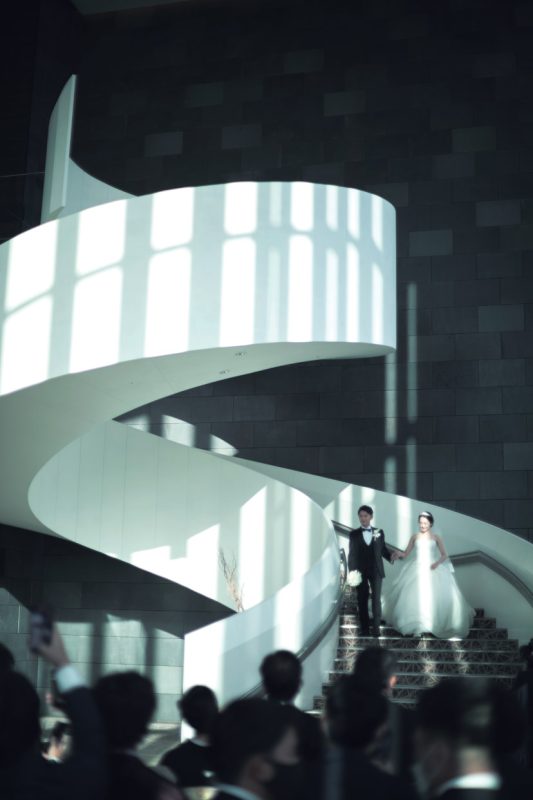 新婦がホテル選びの際、一目惚れしたロビーの螺旋階段。チェロをはじめ弦楽器の生演奏が奏でられ、螺旋階段から降りてくる新郎新婦をより優雅に演出。