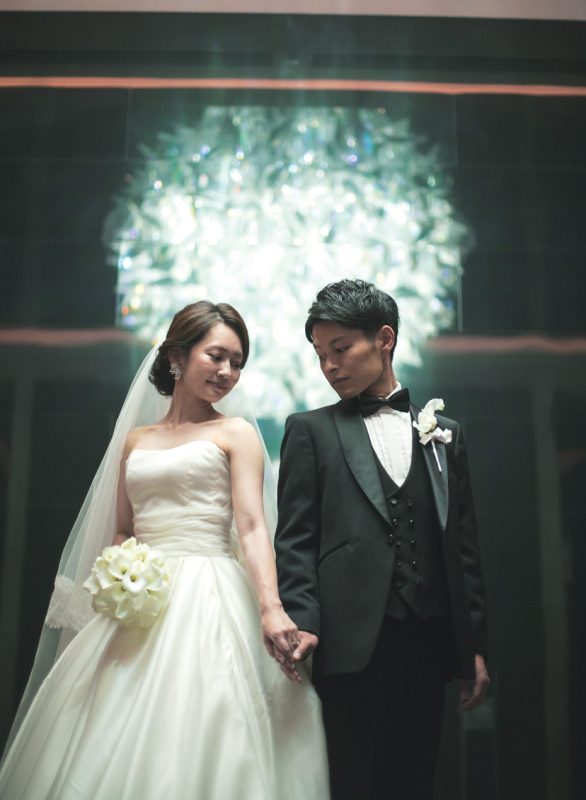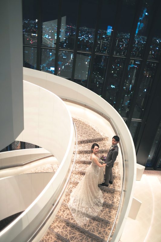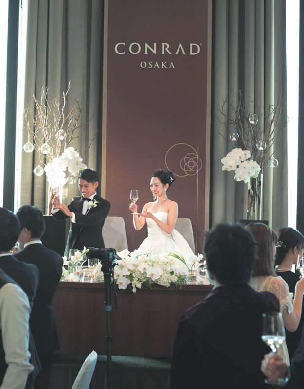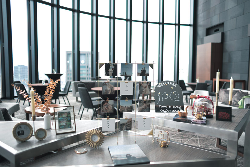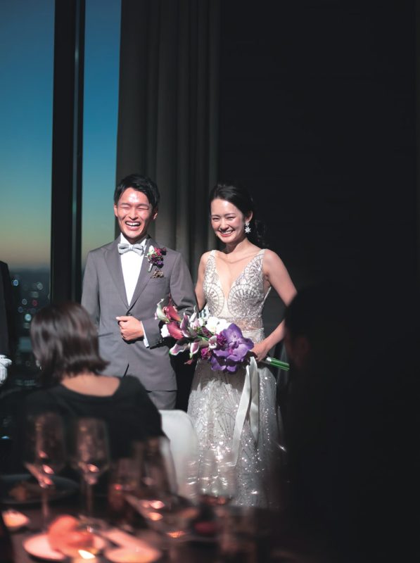 大阪府八尾市で育ったふたりは、社会人になり再会したことをきっかけに結婚。ゲストに共通の友人も多いことから、みんなで楽しむ結婚式を準備した。一番のこだわりは、ゲストを魅了したマジックアワーの演出。大きな窓から夕陽が望めるよう、披露宴のスタート時間を調整し、夜景を邪魔しない会場装飾を