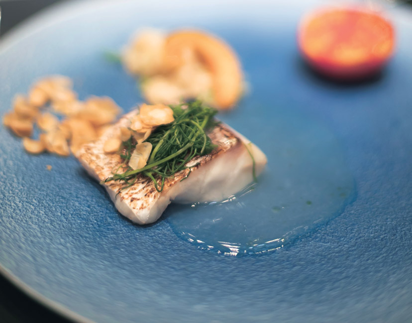 魚料理に大阪八尾の名産「旭ポン酢」を使ったジュレを。メイン前のシャーベットには日本酒を加え洋ナシを添えるなど、こだわりのオリジナル料理にゲストの会話も盛り上がった。