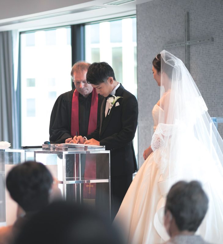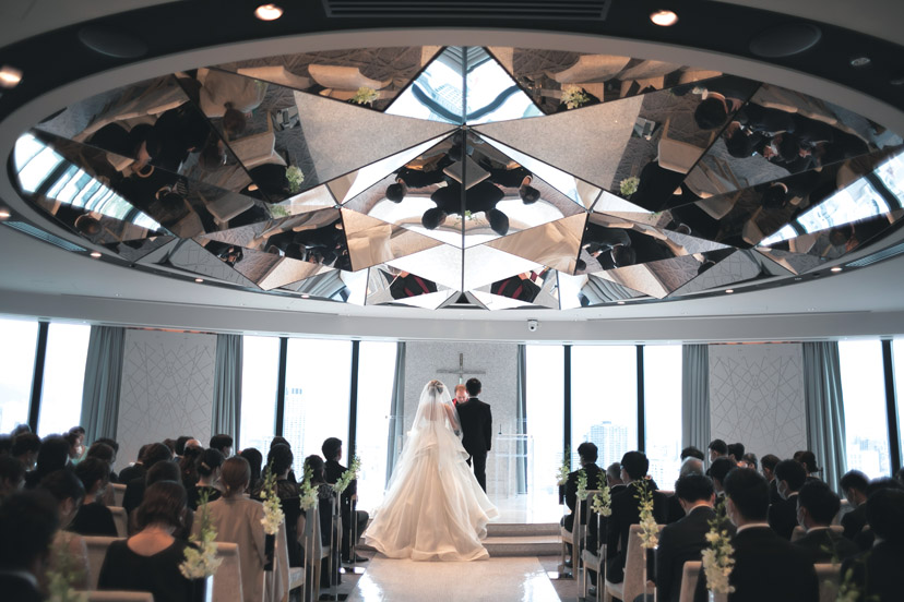 39階「クラウズ」での厳かなキリスト教式。祭壇の前に新郎新婦が揃うとカーテンがオープン。街を見渡す眺望が広がり、爽やかな陽光が上質感溢れるドレスを輝かせる。