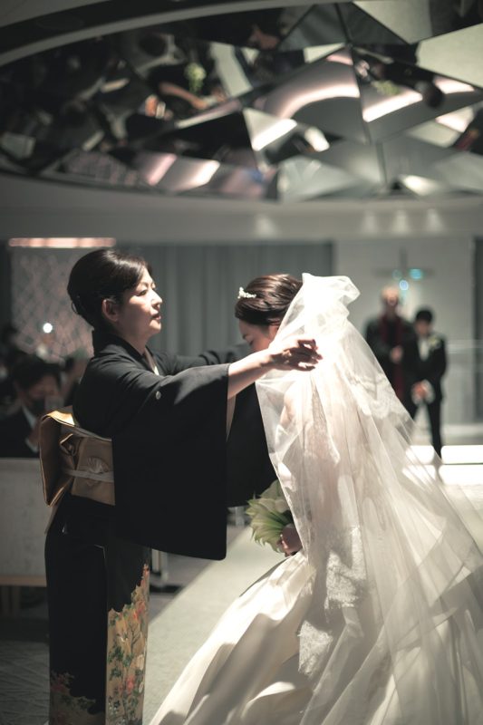 母からの祝福の言葉に、感極まって思わず涙したベールダウン。ファーストミートのためにドレス選びを一緒に行うなど、結婚準備も力になってくれたので感動もひとしお。