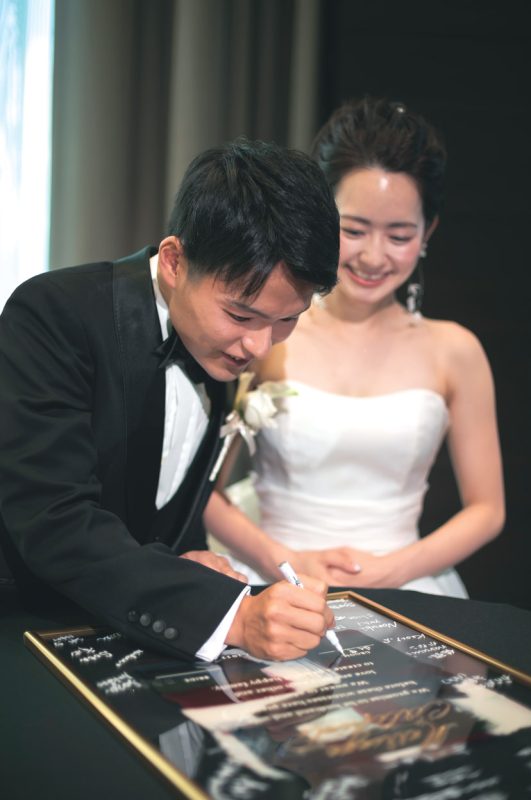 ウエルカムスペースでゲストに署名してもらったメッセージボードに、ふたりもサインしてゲストにお披露目。
