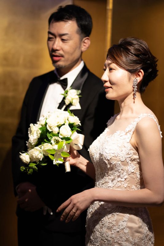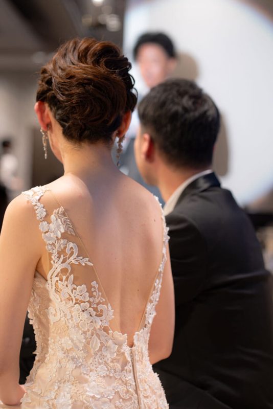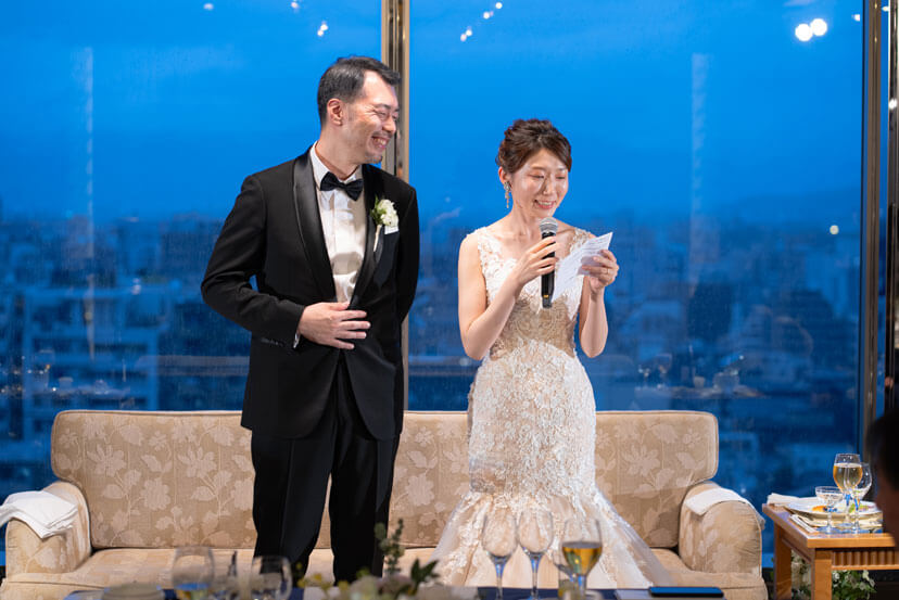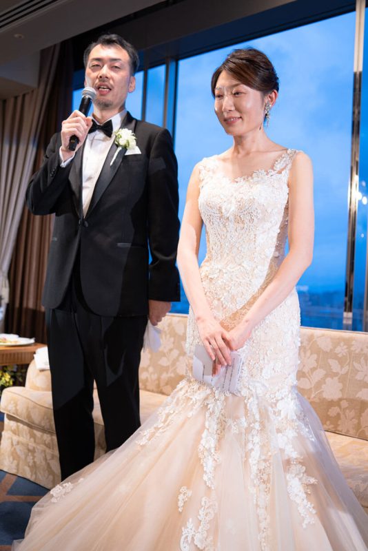 たくさんの祝福をもらえた披露パーティが和やかなうちにお開きに。ふたりでゲストをお見送り。