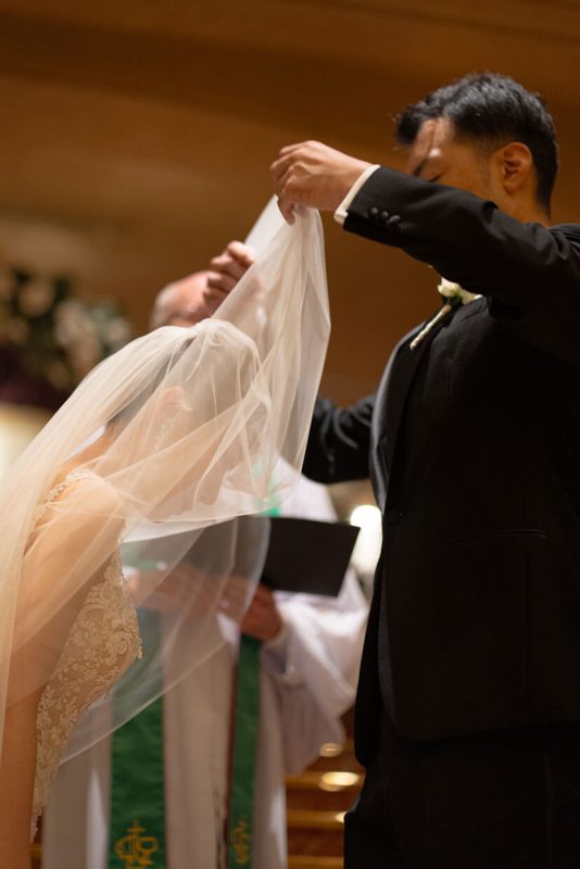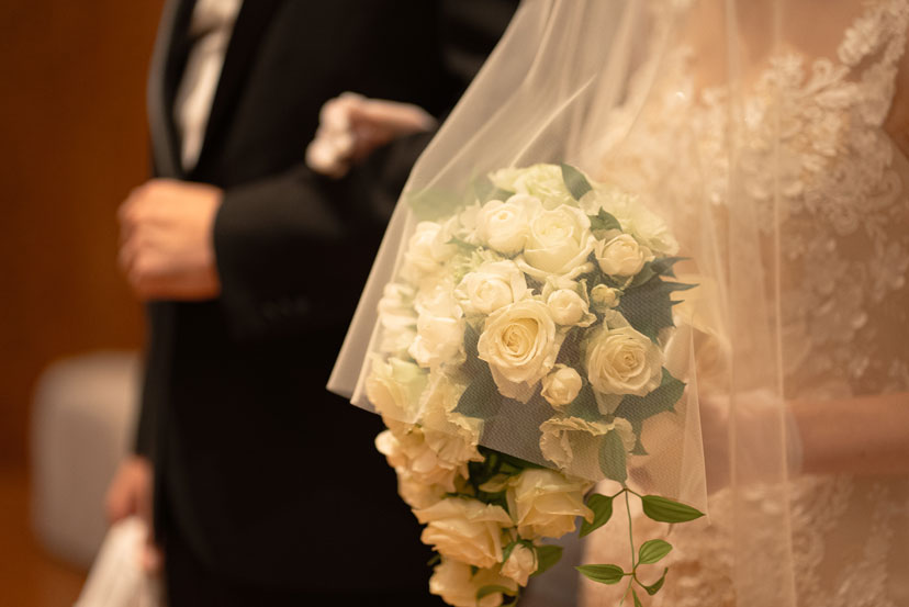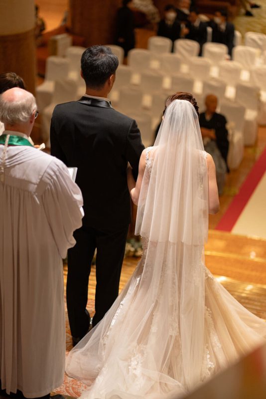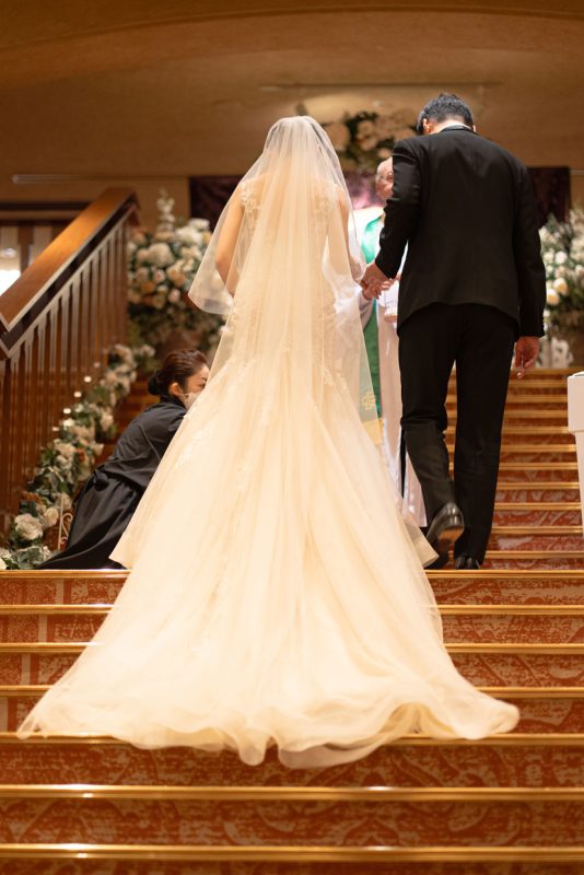 挙式は、ホテルオークラ京都のメインロビーの大階段を舞台に、キリスト教式で執り行われた。