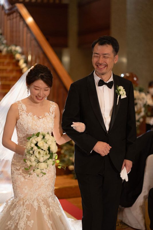 祝福を受けながら、満面の笑顔で退場するふたり。ロビーに居合わせた一般のホテルゲストからもお祝いの言葉をいただけたことも素敵な思い出に。