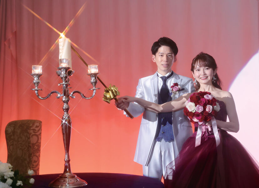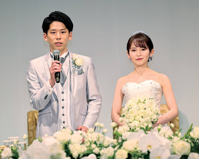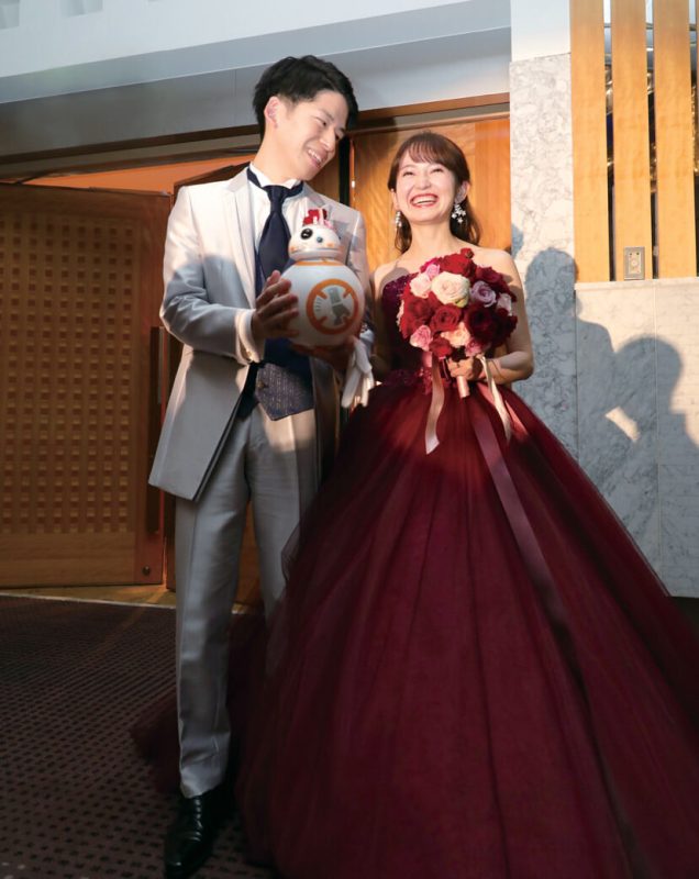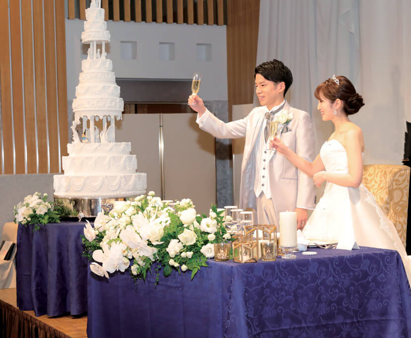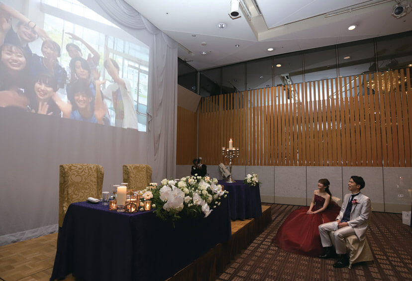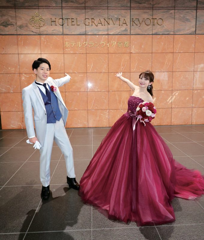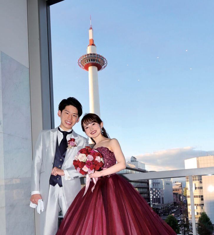 挙式は、このホテルを選んだ決め手にもなったバージンロードやパイプオルガンが印象的なチャペル「マカリオス」で。入場の扉が開き、家族や友人の笑顔に迎えられたシーンは一生の思い出に。式後は京都駅ビルを見渡せる中庭に移動して大きなカリヨンの鐘をふたりで鳴らした。今でも新婦は京都駅で鐘の音を聞く度に結婚式のことを思い出し、幸せな気持ちになるという。披露宴は、ホテルのメインバンケット「源氏の間」で開催。新婦が自作したムービーでゲストとの懐かしい思い出を紹介する演出は、二次会でも話題になるほど盛り上がった。サプライズの中座エスコートや再入場のキャンドルサービス、フォトラウンドでは大切なゲストに感謝の言葉を直接伝えられた。お酒好きが多いゲストのためにワインやビールの銘柄をアップグレードしたおもてなしも大好評で、全員で至福の宴を満喫することができた。ゲストから特にお褒めの言葉が多かったのが、スタッフの方の心遣いだったそうで、このホテルを選んで本当に良かったと改めて喜びを感じたという。