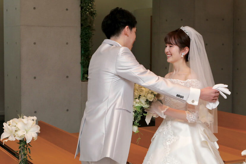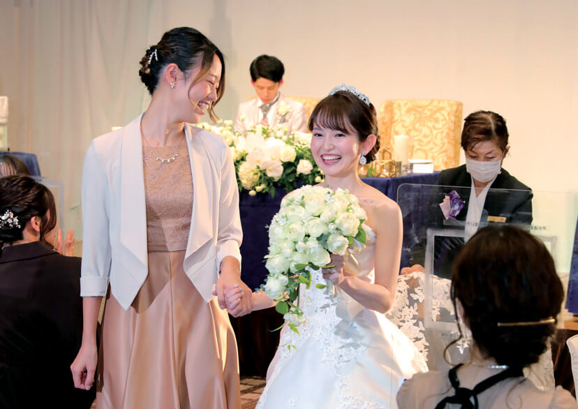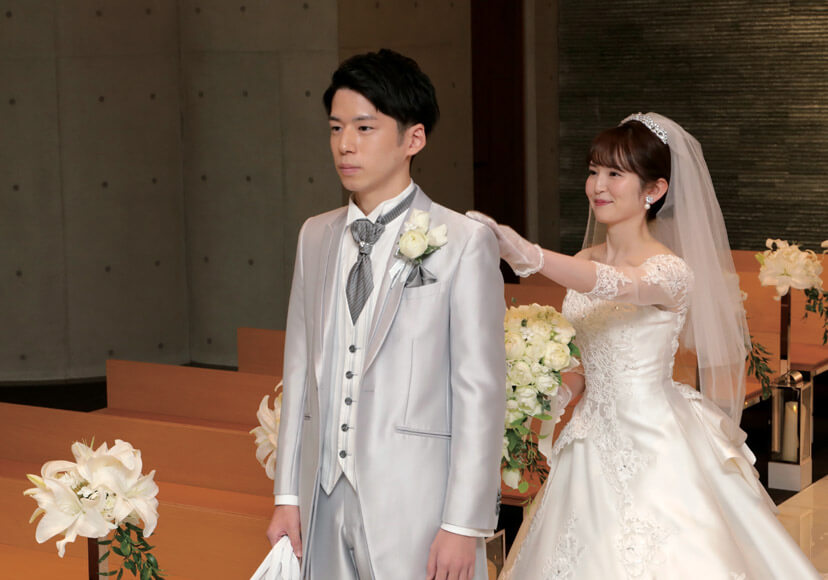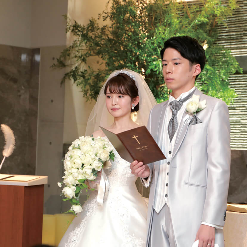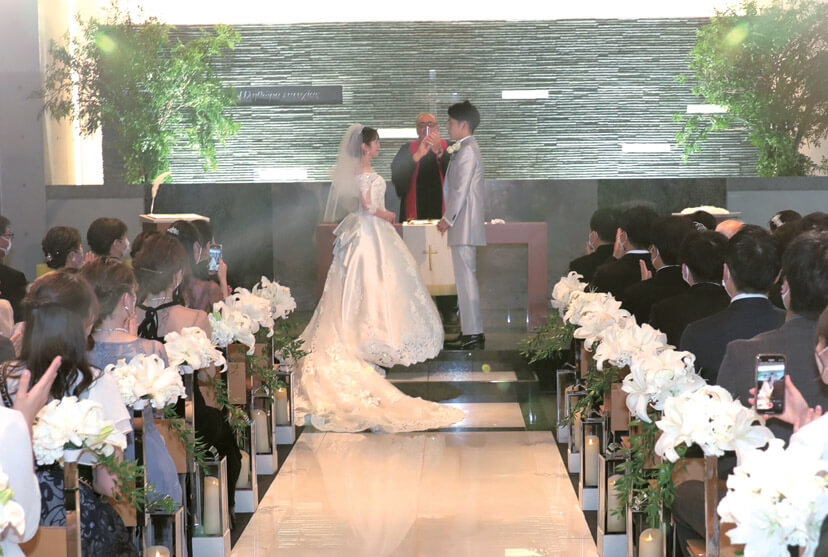 厳かなパイプオルガンの調べが響き渡り、落ち着いた雰囲気のチャペルは、ふたりがこのホテルを選んだ理由のひとつになったほど気に入った場所。参列してくれた大切な人たちの祝福の笑顔に見守られて、感動で胸がいっぱいの挙式となった。