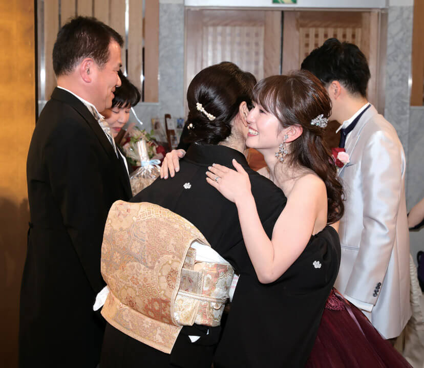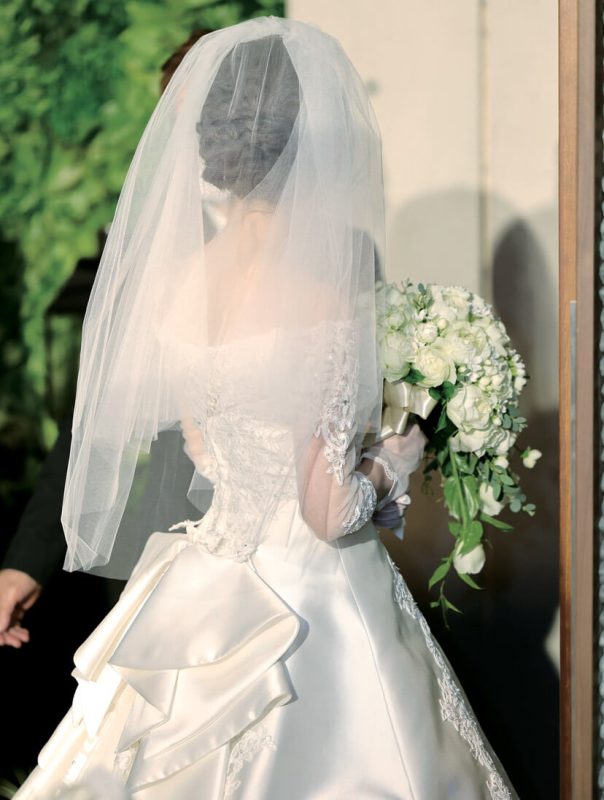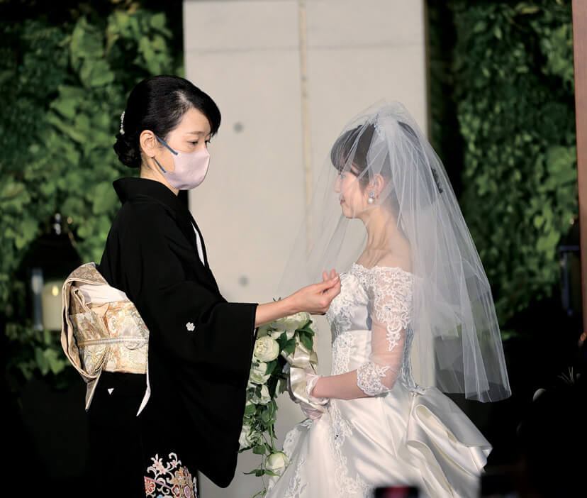 挙式前にチャペルでファーストミート。この日までドレス姿は秘密にしておきたかったので、両親と一緒に衣裳選びをしたのが楽しい思い出に。
