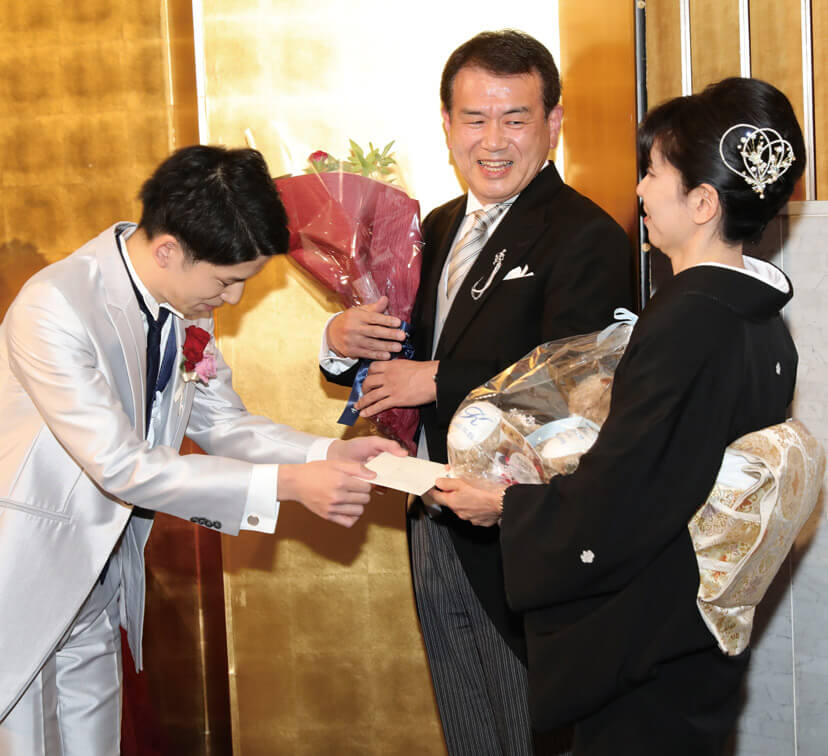 体重ベアと花束を贈呈。新郎からの手紙に新郎母は感激。