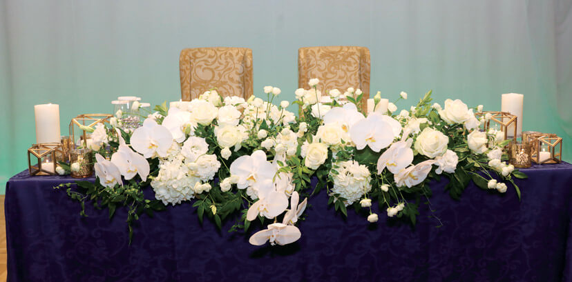 会場装花はホワイト×グリーン、ネイビーのクロスにキャンドルでゴールドをプラス。