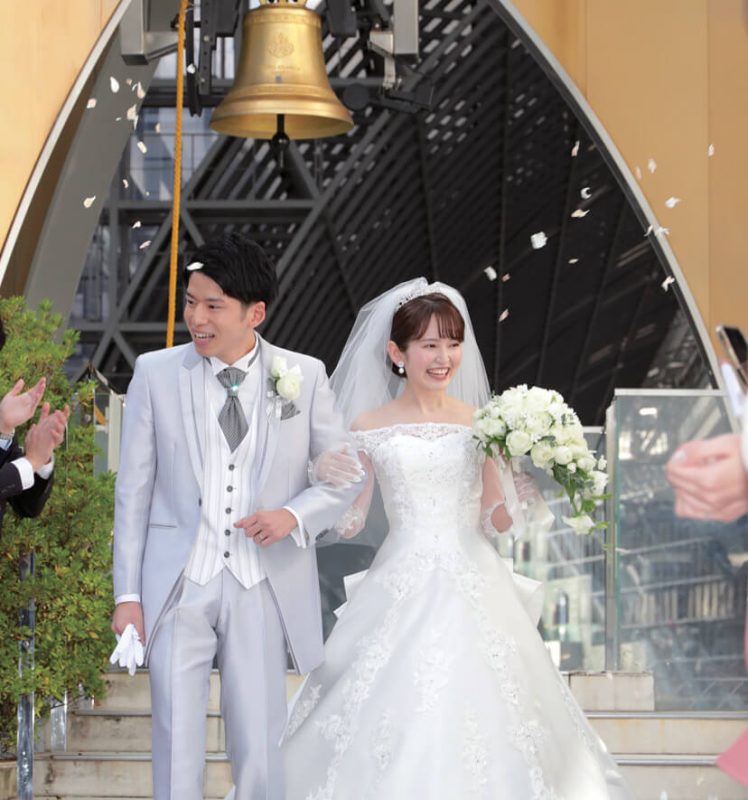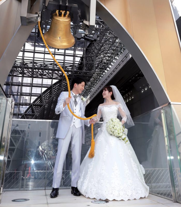 京都駅直上の中庭にある幸せのカリヨンを高らかに鳴らして、フラワーシャワーの祝福を。記念日にホテルで食事をした後、またふたりでこの鐘を鳴らすのが楽しみという新婦。