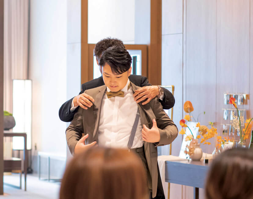 挙式のスタート、新郎の最後のお支度を両親に手伝ってもらうジャケットセレモニーを。お父様にジャケットを着せてもらったり、お母様にブートニアを差してもらいながら温かな絆を感じた新郎。両親にも素敵なプレゼントとなった。