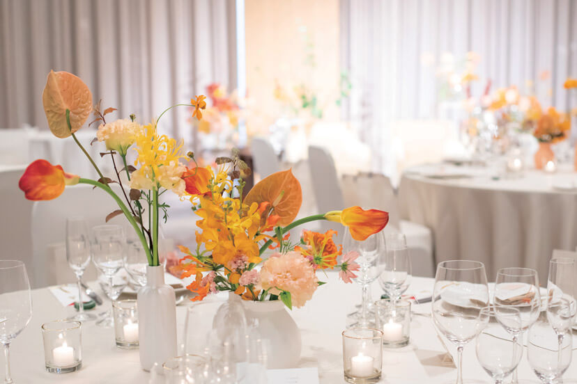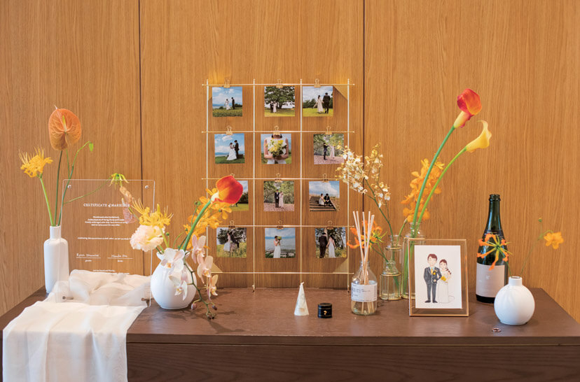 装花にこだわったふたり。ウェイティングスペースもテーブルも素敵な印象に。
