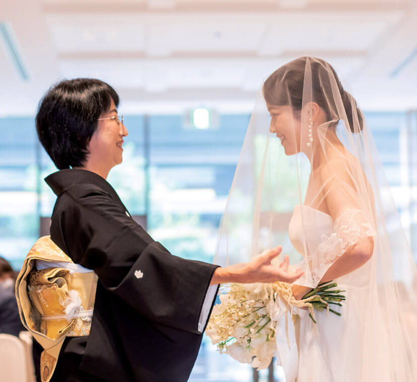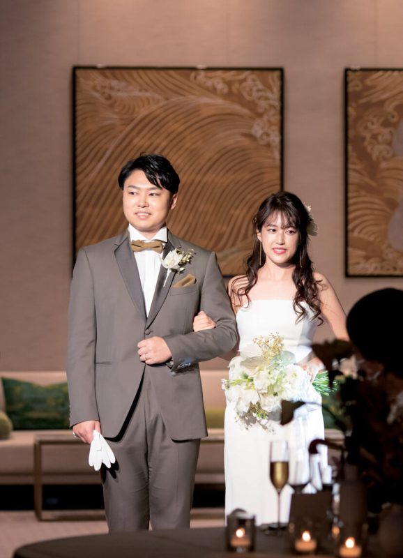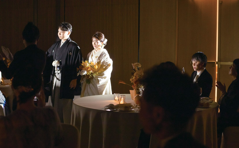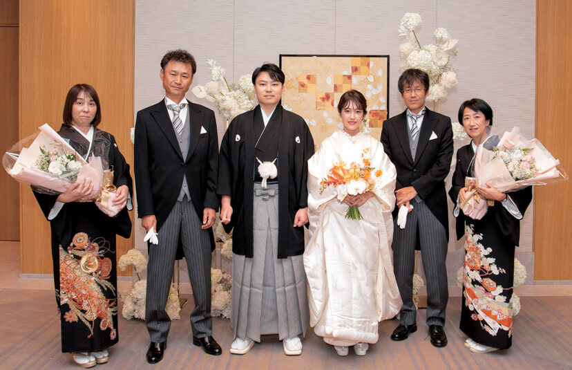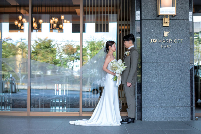 大学時代に友人の紹介で出会い、数年間の交際を経て人生をともに歩むと決めたふたり。コロナ禍で会場を探すなか、大勢のゲストを招待するのか身内だけで少人数の結婚式にするのか状況に合わせて決められるように選んだのが「J Wマリオット・ホテル奈良」。ワンフロア貸切にて結婚式を挙げられること、自由度が高く、ふたりのこだわりに真摯に対応してくれることも大きな魅力だった。特に派手な余興はしなかったが、家族や友人たちにスポットが当たる演出で感謝の気持ちを表現した。挙式は人前式で行い、入場前にゲスト一人ひとりへ気持ちをしたためた手紙を読んでもらうレターセレモニーからスタート。新婦のベールダウンだけでなく新郎もジャケットセレモニーにて両親と想いを交わした。披露宴でもお色直し退場時のエスコートや鏡開きの演出に家族・兄弟が揃う姿を披露。それぞれの親友のスピーチに涙するなど大切な人たちとのつながりを実感し、生涯忘れられない一日に。「プランナーさんをはじめ、スタッフのサポートで想いやこだわりを叶えられた」と熱く語ってくれた。