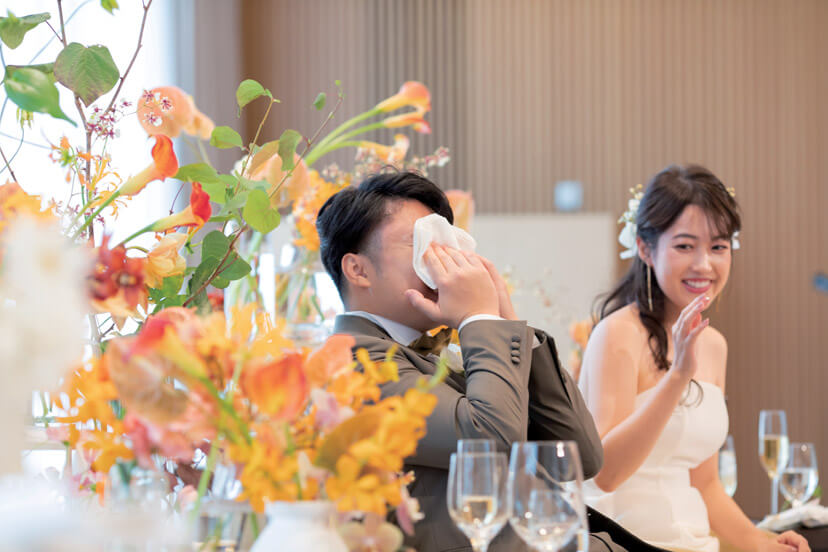 幼馴染のゲストのスピーチに新郎が感極まって涙。