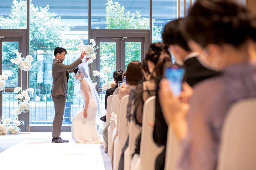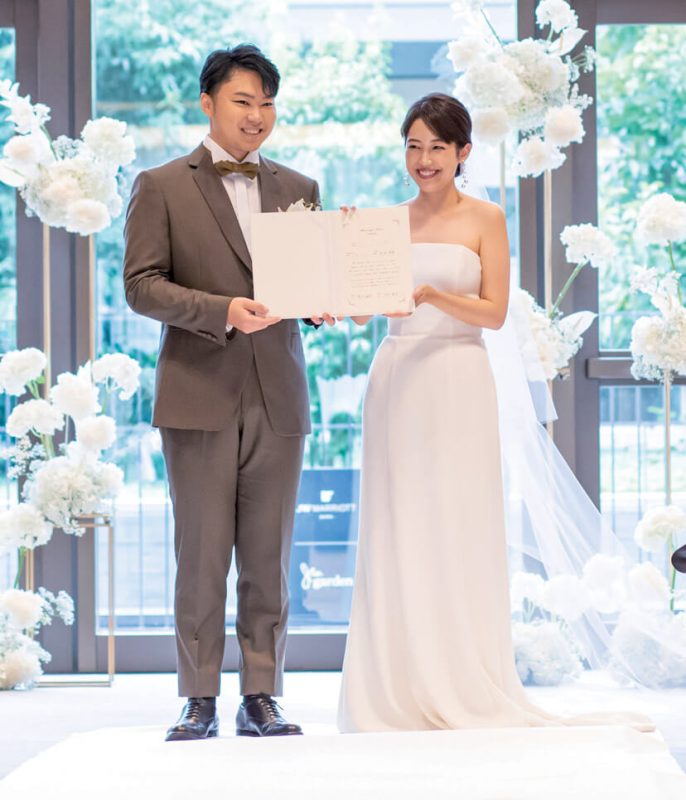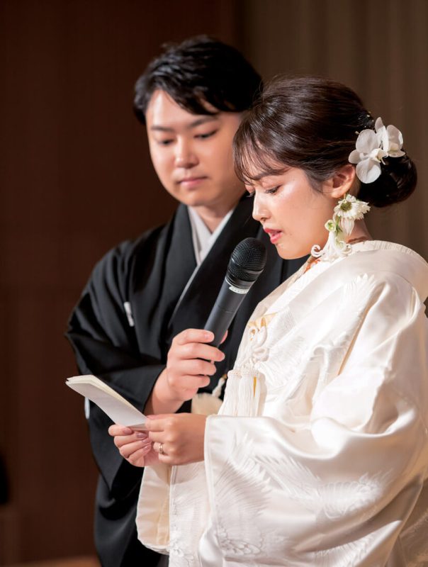 ゲストの前でベールアップの後、自分たちの言葉で書いた誓いの手紙を読むふたり。ともに人生を歩む決意を胸にした。