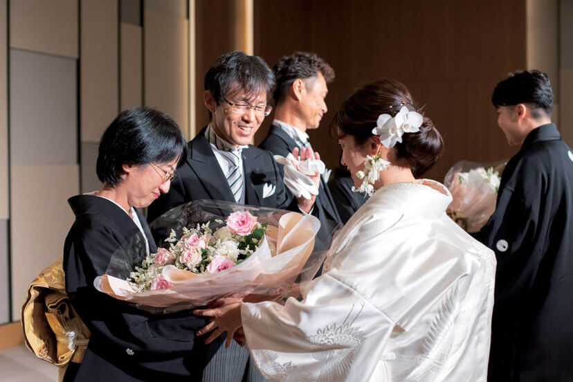 想いを込めて新婦両親への手紙を朗読、花束をプレゼント。お互いの両親とともに記念撮影。