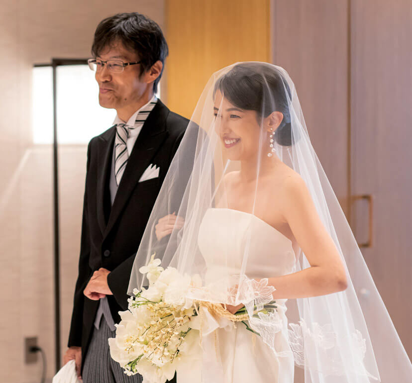 お母様からベールダウンしてもらった新婦、お父様のエスコートでバージンロードを歩いて新郎のもとへ。幸せいっぱいの笑顔が印象的。