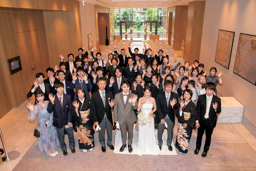 挙式後、家族や友人たちと記念写真。みんなの晴れやかな笑顔は宝物に。