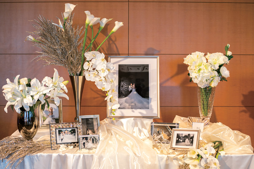 多彩なフォルムの白い花がゲストをお出迎え。シルバーの花器や写真立てがスタイリッシュな雰囲気に。
