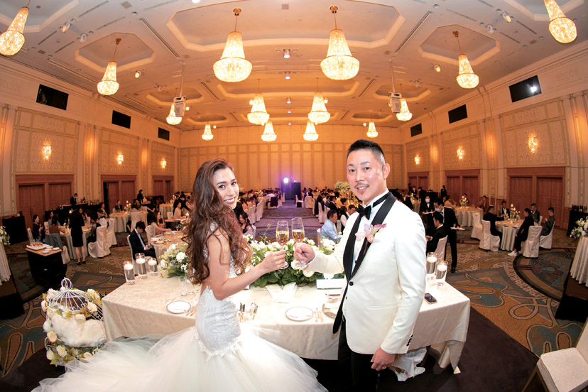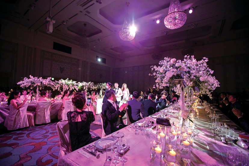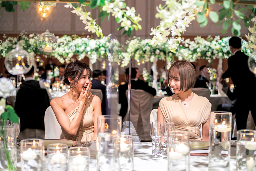 ルを使った晩餐スタイルやこぼれるような白い装花でロイヤル感を演出。シーンによって変わる色鮮やかな照明に映えるよう、衣裳や装花は白×シルバーで統一した。ゲストからも大好評だった料理に合わせて、友人たちが好きな珍しいウイスキーを用意。子どもゲストへの、お菓子や名前入りのキーホルダーなどの新婦お手製の福袋も、ママたちから喜ばれた。2 次会も同じフロアの会場に装花を移し、友人たちとの楽しいひとときを満喫。後日ゲストから「あまりに楽しくてあっという間だった」「歌あり、笑いあり、感動ありで最高だった」とうれしい声が届いた。