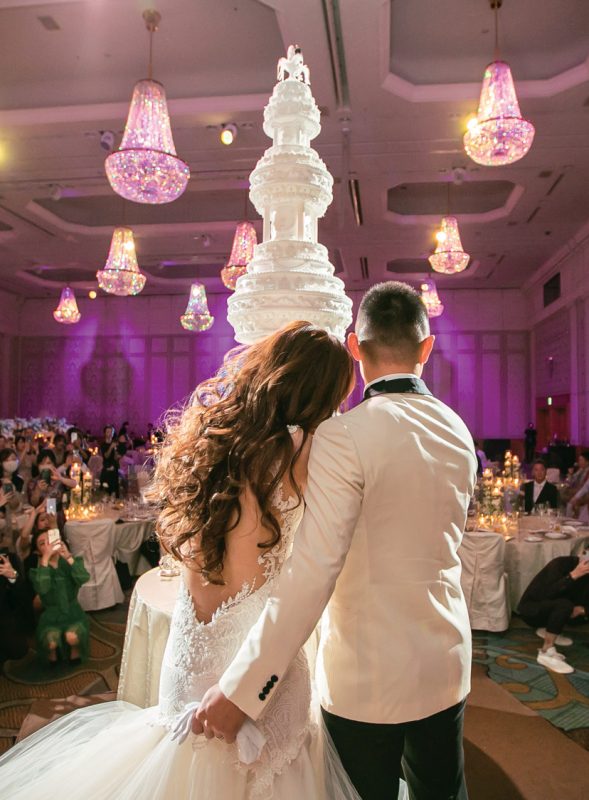 親族には懐かしく、友人たちには新鮮な高さと存在感のあるウエディングケーキ。