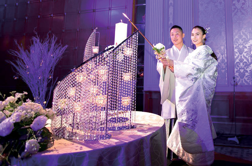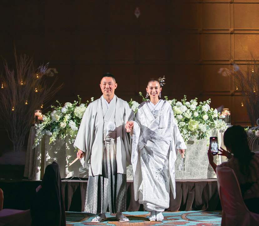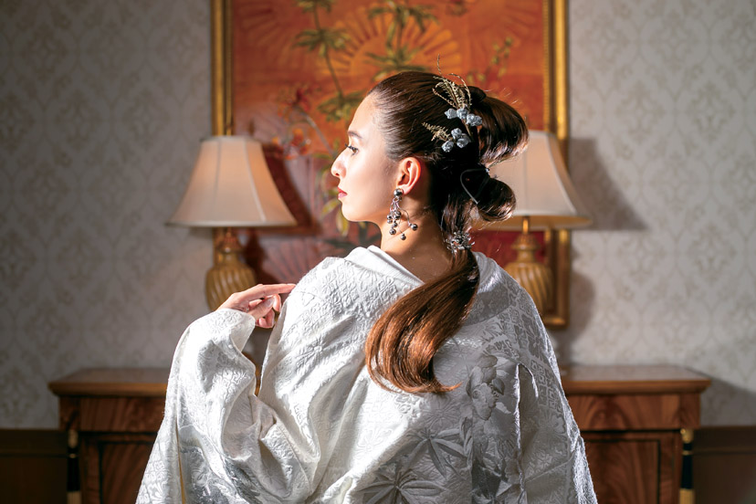 小物まで純白にこだわって選んだ銀糸の白無垢。純白からシルバーグレーへのグラデーションがお洒落な羽織袴も、ライトの中で際立つ主役の存在感 。