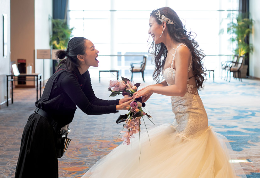 ヘアメイクは超人気アーティストの「CEU」服部さんへ依頼。タイトなシニヨンもお洒落なアレンジに。