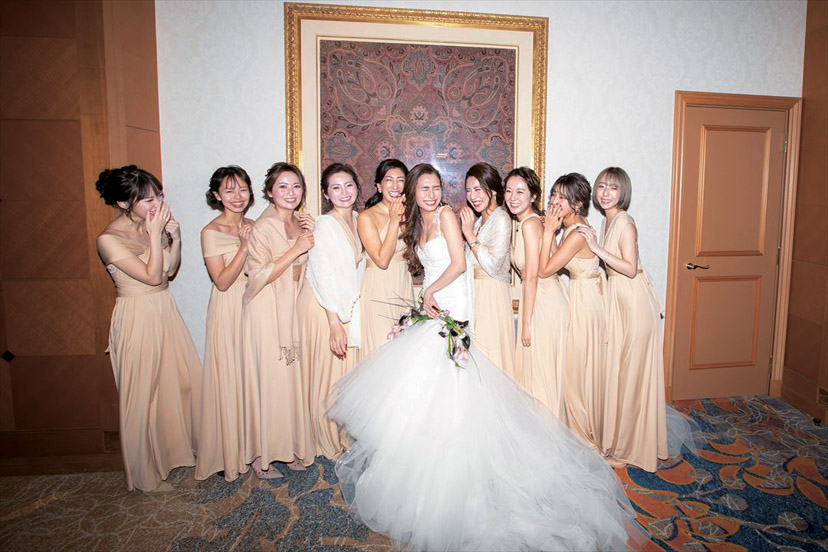 「結婚式はガリア ラハヴのドレスで」と決めていた新婦。自身でドレスショップを経営していることもあり、強いこだわりから理想のドレスが身にまとえる「名古屋マリオットアソシアホテル」での挙式を決めた。挙式は前日から両家家族とホテルに宿泊し、夕食はホテルのレストランで家族との会食を。当日は早朝からお仕度をスタートさせ、新婦が夢に見ていた憧れのドレス姿に。ロングテーブ