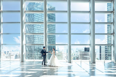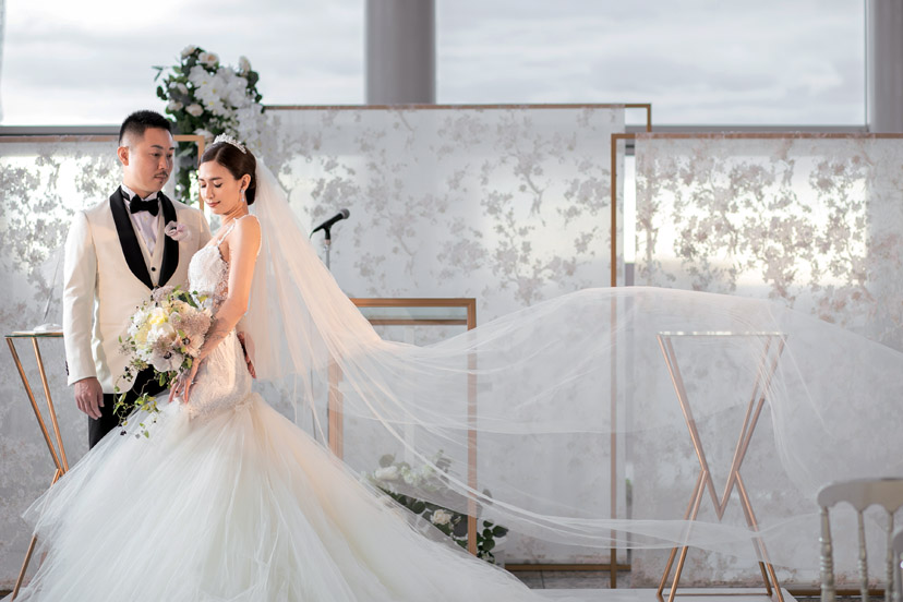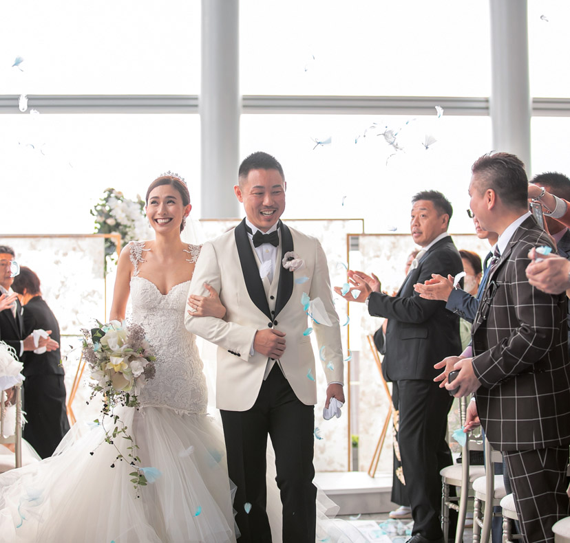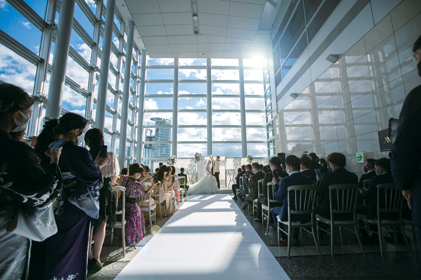 名古屋の街を見渡すパノラマビューの大空間「スカイストリート」で厳かなキリスト教式を。今にも降りそうな雨空にもかかわらず、ふたりが祭壇へ立った瞬間に陽光が降り注ぎ、まるで神様に祝福されているような奇跡的なセレモニーに。