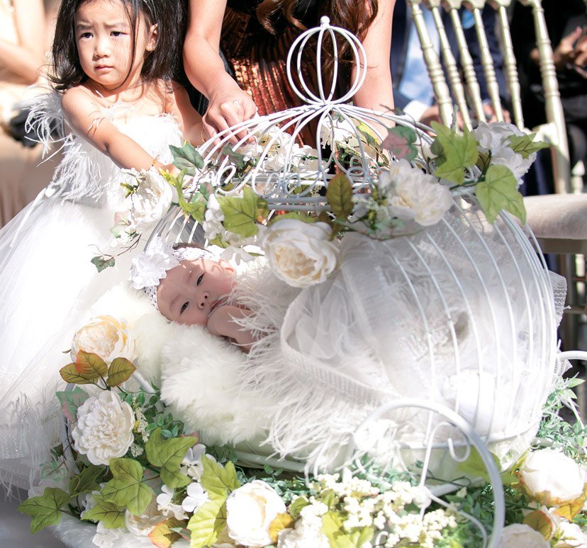 天使をイメージして、新婦がデザインしたリングガールのドレス。フェザーをあしらった軽やかなディテールがキュート。
