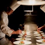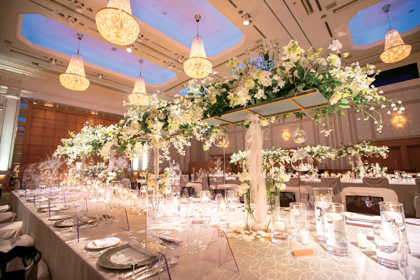 豪華なシャンデリアが美しく輝く、天井高8mの大空間を純白の生花と流れ落ちるようなグリーンで贅沢に装飾。