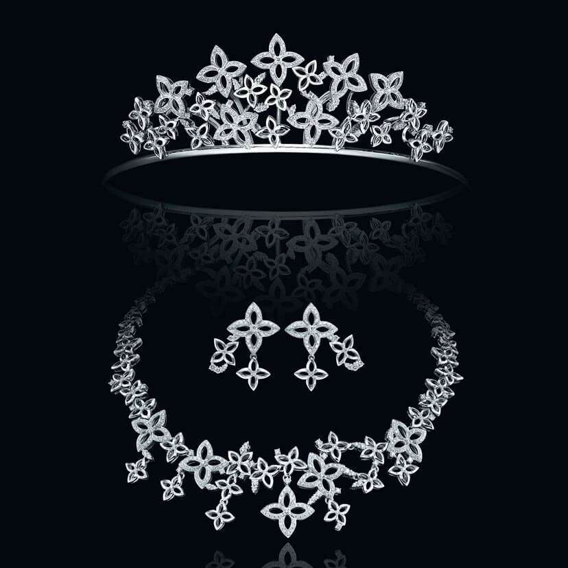フランス語で「星の畑」という名を冠したティアラセット。美しい星の瞬きのように7.04カラットのダイヤモンドが輝き、花嫁を祝福する人々をもファンタジーの世界へと引き込んでくれる。