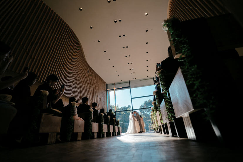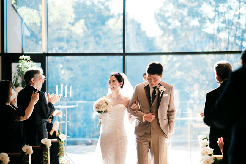 木の香りのチャペルに心惹かれ、「このバージンロードを歩きたい」と思ったこともホテルを選んだ理由。挙式では父と親戚の女の子と一緒にリラックスしながら入場。挙式後、輝く花嫁の笑顔がゲストを魅了した。